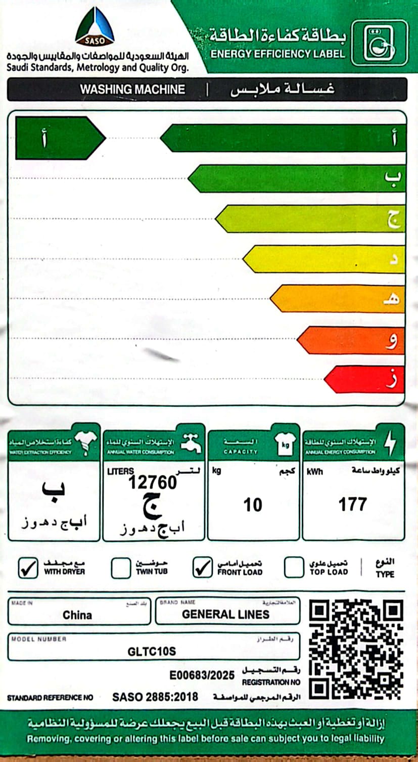 غسالة اوتوماتيك جنرال لاينز 10 كيلو تنشيف 7 كيلو 14 برنامج استيل انفرتر موديل GLTC10S
